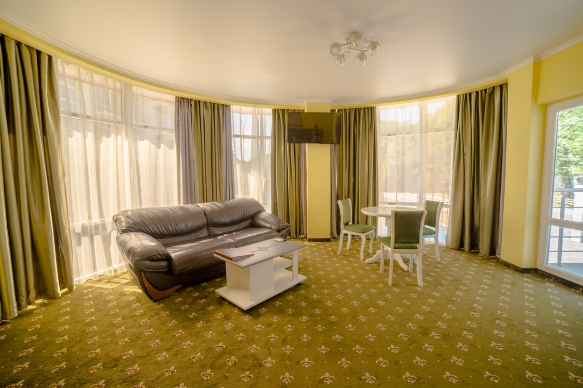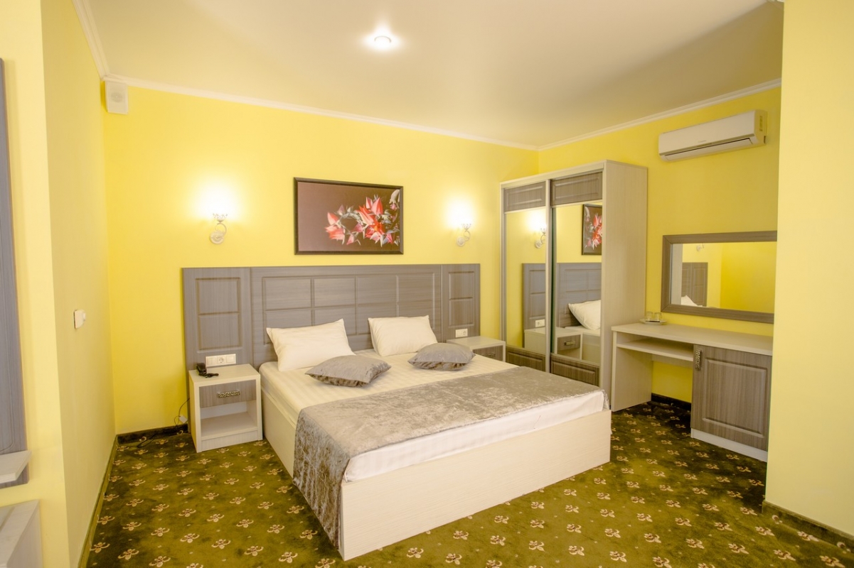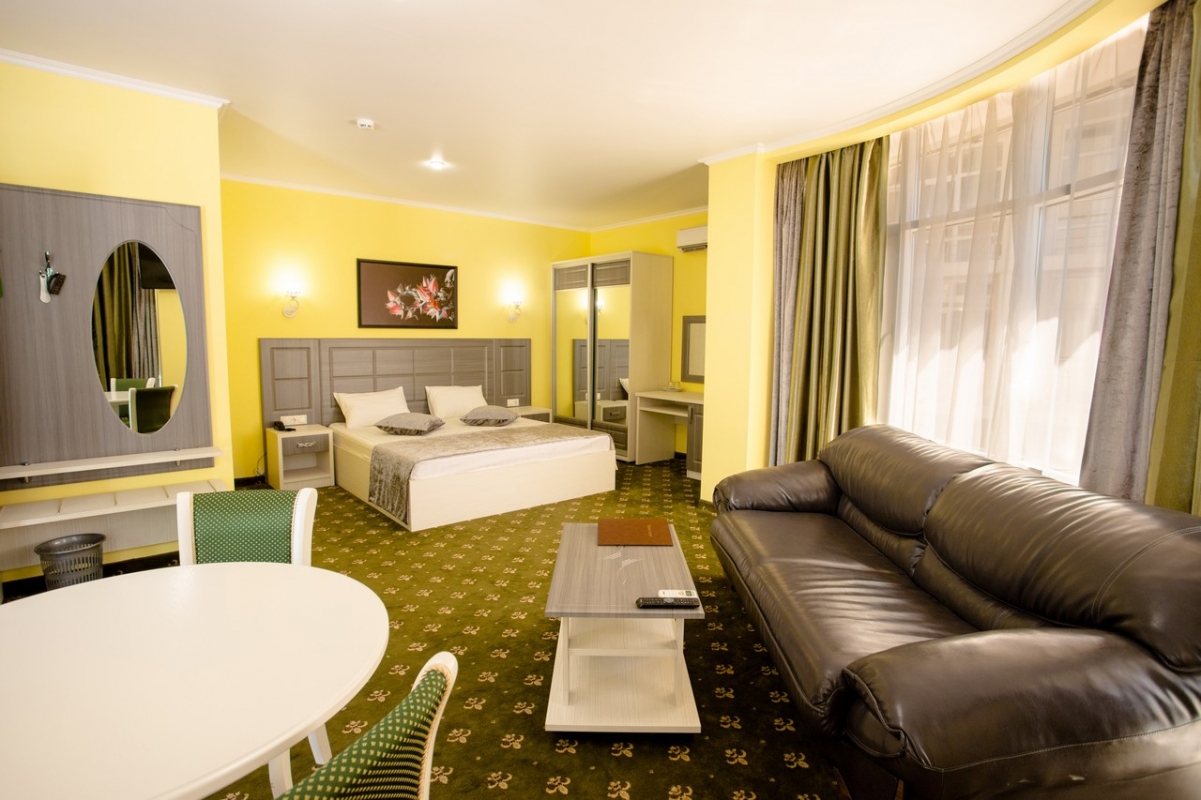 Площадь номера - 39 кв.м. Основных мест - 3. Дополнительных мест - 2. Возможно размещение 3-х человек на основных местах + 2 дополнительных места.. В номере: душ, туалет, ТВ, холодильник, сейф, фен, телефон, двуспальная кровать, диван, балкон, сейф, диван, сплит-система, чайная станция.