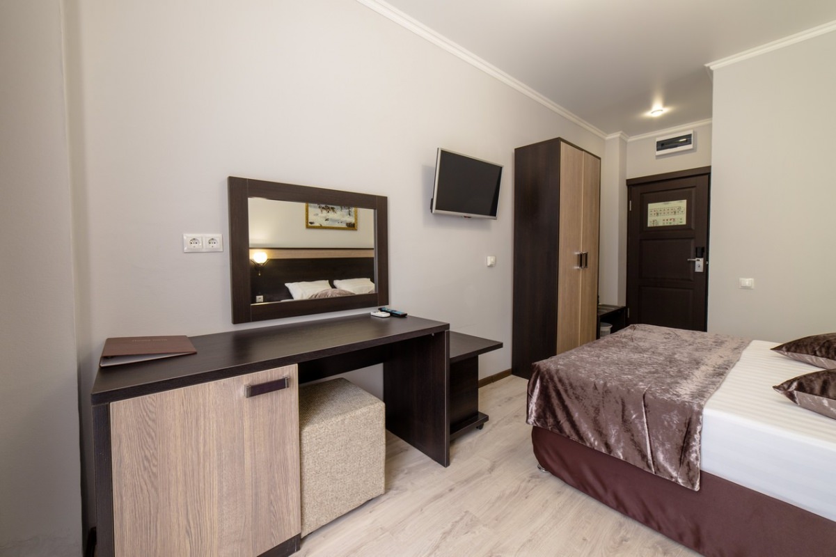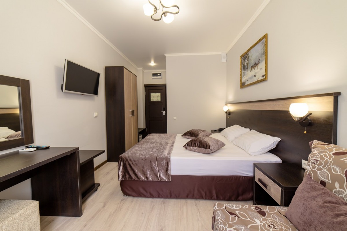 В номере просторная двуспальная кровать или две односпальные. Дополнительное место — раскладной диван.