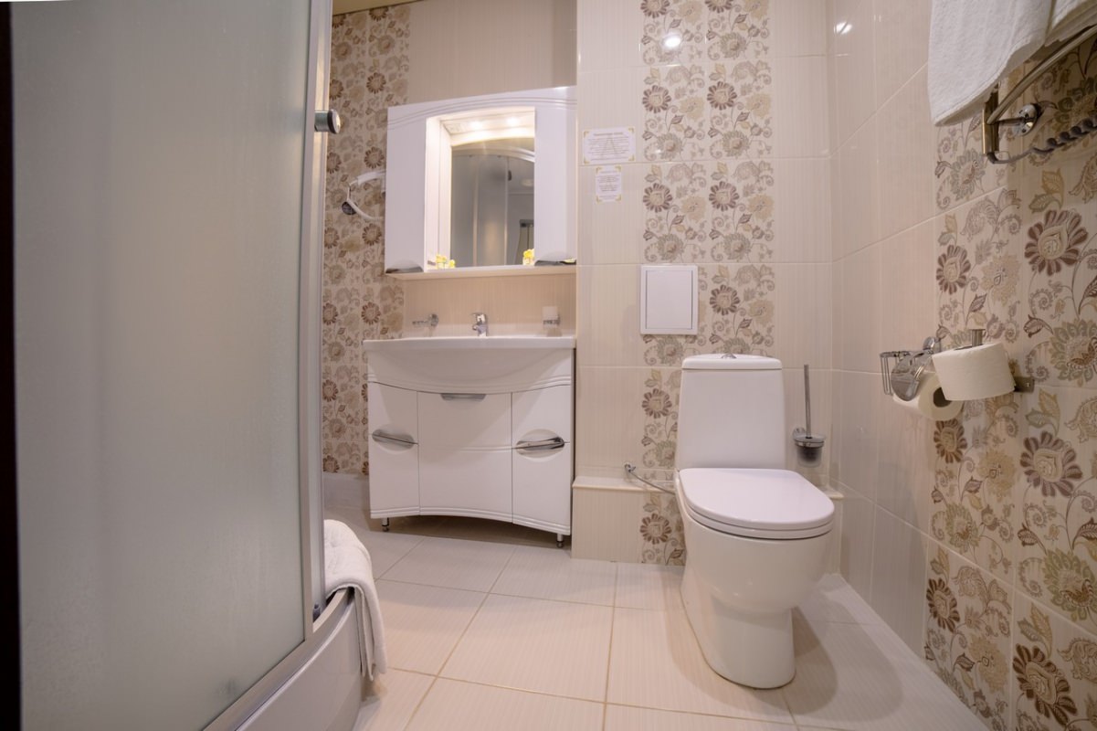 Санузел выложен красивой плиткой. Тут расположена душевая кабина и туалет, имеется комплект полотенец.
